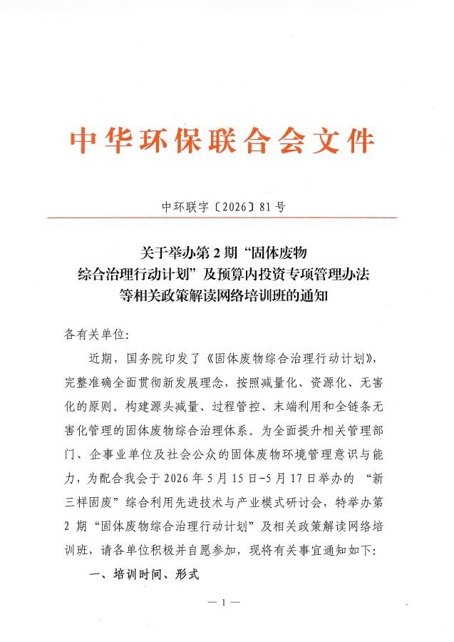 关于举办第2期“固体废物综合治理行动计划”及预算内投资专项管理办法等相关政策解读网络培训班的通知