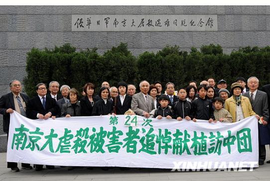 当日,日本第24次悼念南京大屠杀遇难者植树访华团一行25人在侵华日军南京大屠杀遇难同胞纪念馆举行了悼念活动,并在纪念馆的和平公园内修剪他们24年来在纪念馆所植下的树木。为表达对中国人民的歉意,日本“绿色赎罪”植树访华团自1986年来24次来南京植树6万多棵。新华社记者韩瑜庆摄