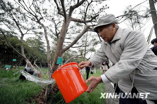 3月31日,日本第24次植树访华团成员为该团首次来南京栽种的千头松浇水。新华社记者韩瑜庆摄