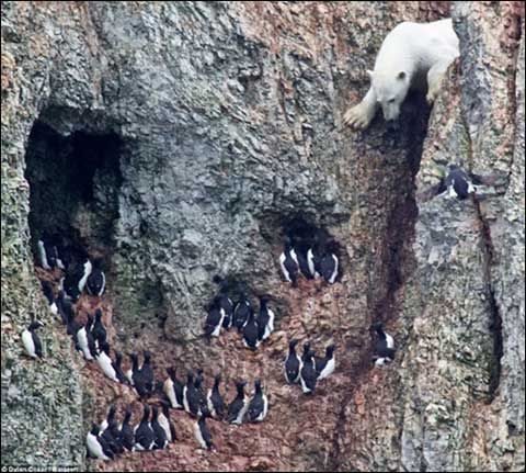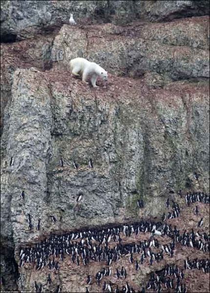 美国摄影师库克曾经在俄北极圈地区拍到了一组北极熊冒生命危险爬下悬崖觅食的神奇图片。这头北极熊为吃到美味的海鸟蛋,在90米高的陡峭悬崖壁一步步往下爬。库克称:“北极熊所处高度和悬崖陡峭程度都令人惊叹。观光艇上不时有人因紧张而喘息。”(图片来源:百度)