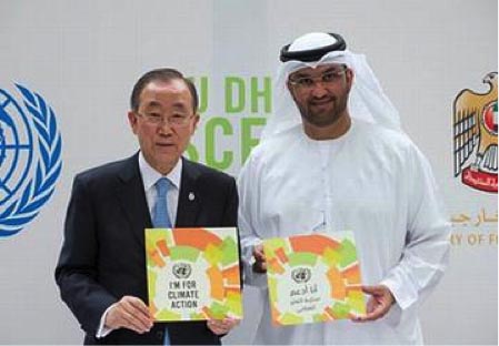 2014年5月4日,阿联酋在阿布达比酋长国召开高级别会议,进一步推广9月23日的联合国气候变化峰会。在记者招待会上,联合国秘书长潘基文(左)与阿联酋气候变化问题特使艾哈迈德·阿尔贾柏(Sultan Ahmed Al Jaber)手持“支持气候行动”标语。(图片来源:联合国)
